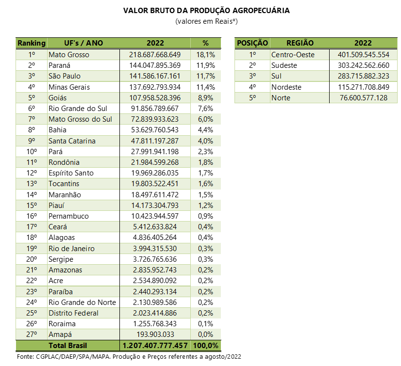 Os resultados regionais mostram a liderança de Mato Grosso, Paraná, São Paulo e Minas Gerais na geração de valor na agropecuária. Em valores absolutos o montante é de R$ 642,9 bilhões, o que corresponde a 53,2% do VBP total.