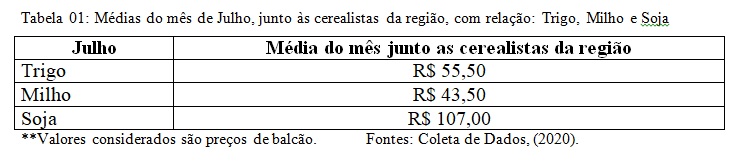 A Tabela 01, abaixo fará referencia aos preços médios pagos pelas principais cerealista da região durante o mês de Julho de 2020.