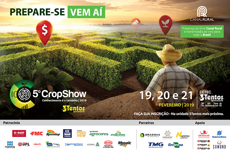 A quinta edição do Crop Show 3Tentos será realizada de 19 a 21 de fevereiro, no Centro Tecnológico da empresa (Cetec), em Santa Bárbara do Sul. O evento também comemora o aniversário de 24 anos da empresa e espera receber mais de 3000 pessoas, entre produtoras e produtores rurais, estudantes e demais públicos ligados aos setores da agricultura.