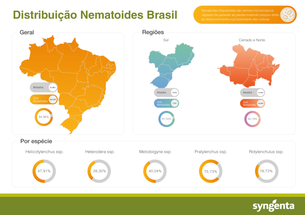 Hoje, as regiões mais impactadas pela presença dos nematoides no solo são Sul, Centro-Oeste e Norte, em especial no Cerrado. Em alguns estados, os vermes estão presentes em mais de 99% das amostras. A espécie Pratylenchus ssp., por exemplo, é a mais identificada, chegando a mais de 75% das áreas analisadas. No mapa abaixo, é possível ter uma dimensão da situação atual.
