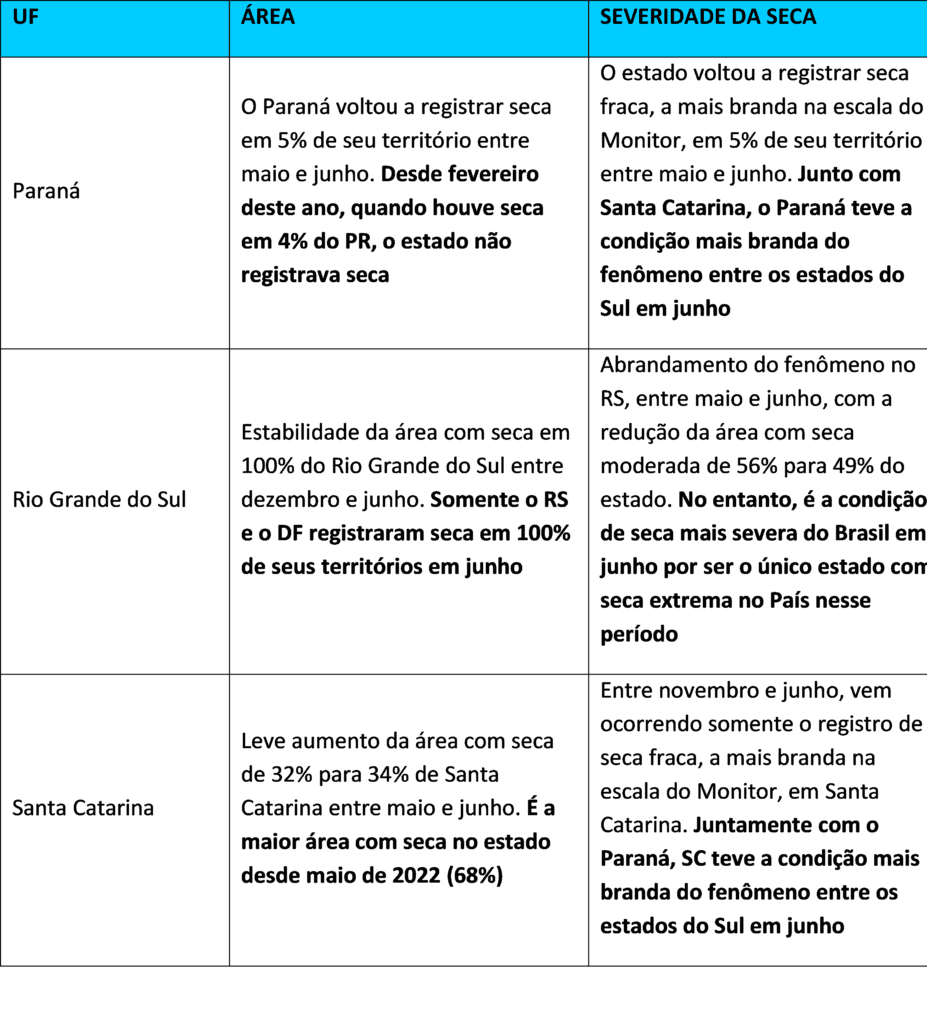 Na comparação entre os dois meses, em termos de área com seca, Santa Catarina teve o avanço do fenômeno de 32% para 34% de seu território. O Paraná teve o retorno do fenômeno em 5% de sua área. Já o Rio Grande do Sul se manteve com seca em 100% de seu território entre maio e junho. A seguir estão os destaques por estado.