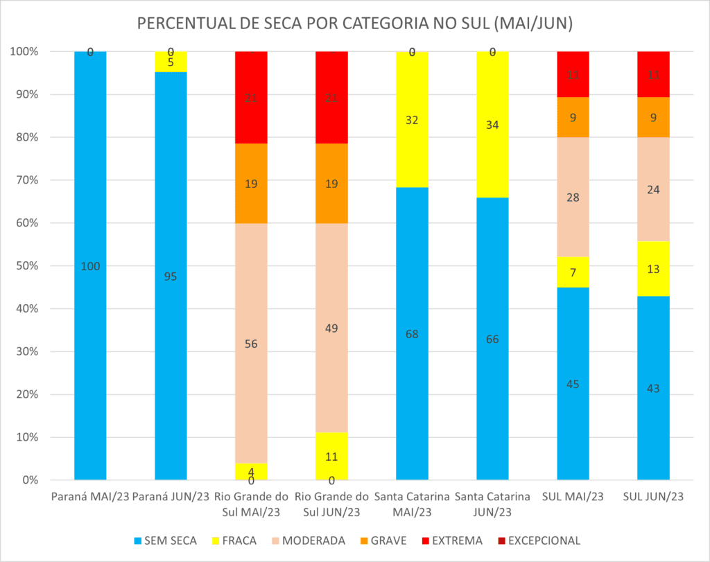 Entre maio e junho, a seca teve um abrandamento no Rio Grande do Sul com a redução da área com seca moderada de 56% para 49% do território gaúcho, conforme a última atualização do Monitor de Secas. Em Santa Catarina a severidade do fenômeno se manteve estável, já que o estado registrou somente seca fraca nesses dois meses. Já no Paraná o fenômeno voltou a ser registrado, pela primeira vez desde fevereiro, com o retorno da seca fraca em 5% do estado. Para a região Sul como um todo, a melhora nas condições do Rio Grande do Sul se refletiu na diminuição da seca moderada na região, indicando o abrandamento do fenômeno em termos regionais nesse período.