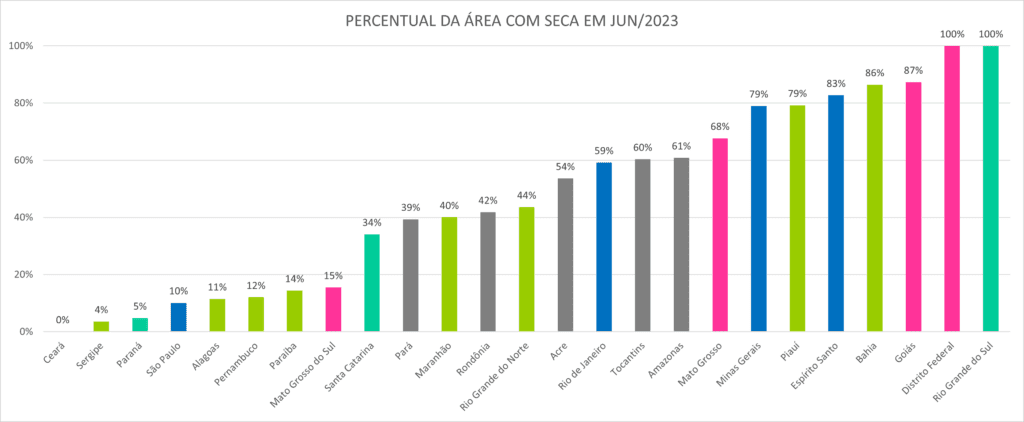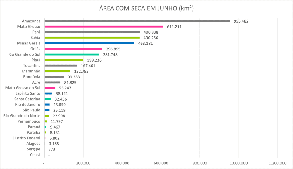 Com base no território de cada unidade da Federação acompanhada, o Amazonas lidera a área total com seca de junho, seguido por Mato Grosso, Pará, Bahia e Minas Gerais. No total, entre maio e junho, a área com o fenômeno aumentou de 3,61 milhões de quilômetros quadrados para 4,5 milhões de km², o equivalente a 53% do território brasileiro.