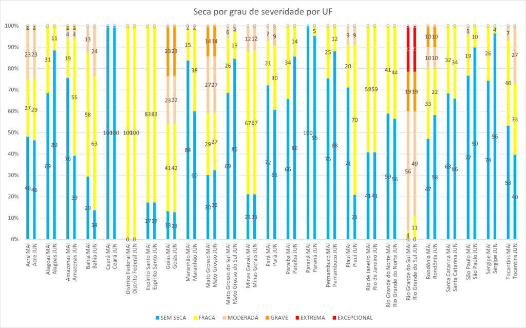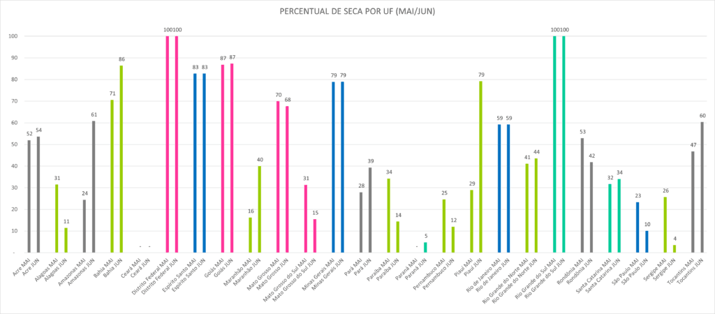 Na comparação entre maio e junho, oito estados tiveram uma diminuição da área com seca: Alagoas, Mato Grosso, Mato Grosso do Sul, Paraíba, Pernambuco, Rondônia, São Paulo e Sergipe. Em outros nove estados houve aumento da área com o fenômeno: Acre, Amazonas, Bahia, Maranhão, Pará, Piauí, Rio Grande do Norte, Santa Catarina e Tocantins. As áreas com seca se mantiveram estáveis em maio em seis unidades da Federação: Distrito Federal, Espírito Santo, Goiás, Minas Gerais, Rio de Janeiro e Rio Grande do Sul. Nesse período o fenômeno não aconteceu no Ceará e voltou a ser registrado no Paraná.