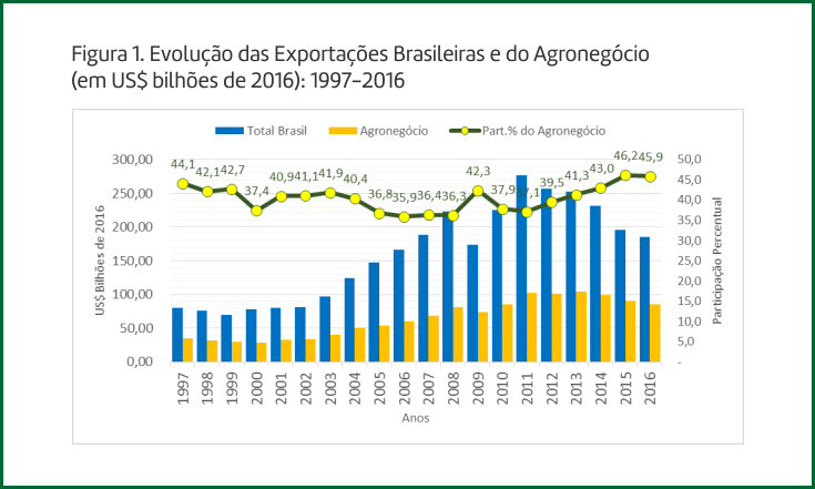 A importância do segmento também é verificada pelos sucessivos superávits na Balança Comercial brasileira. Na história recente, o agronegócio foi responsável por cerca de 40,5% das exportações totais, conforme pode ser observado na Figura 1.