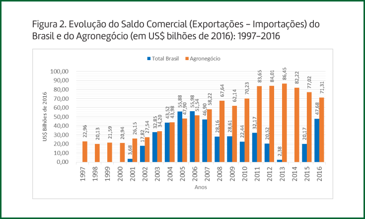 Quando analisado o saldo comercial (exportações – importações) do agronegócio com o saldo comercial do restante da economia brasileira, observa-se que somente nos anos de 2005 e 2006 o desempenho do conjunto do comércio exterior brasileiro foi superior ao desempenho do saldo comercial do agronegócio (Figura 2).