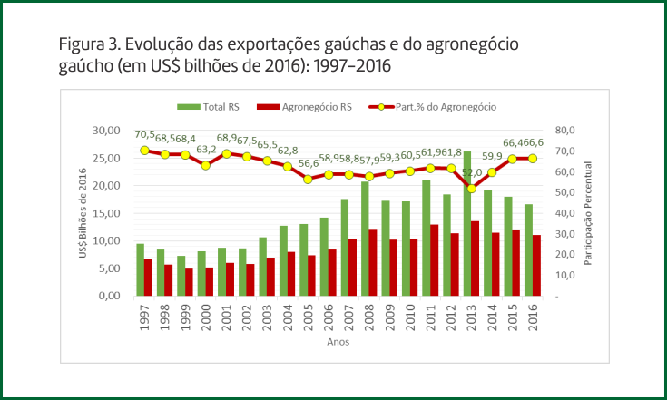 No RS, as exportações dos complexos soja (grão, farelo e óleo) e carnes (bovina, frango, pato, peru, suína e equina), fumo e seus produtos, produtos alimentícios diversos e outros, contribuiu para colocar o superávit do agronegócio numa condição superior ao superávit do conjunto da economia nos últimos 20 anos. Mesmo no ano de menor representatividade, o segmento foi responsável por 52% das exportações estaduais.