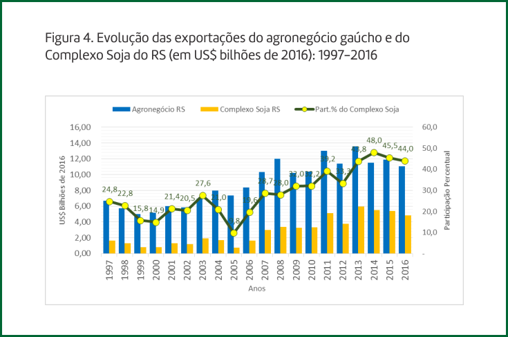No período analisado, o crescimento médio das exportações do complexo soja foi de US$ 269,7 milhões por ano entre 1997 e 2016 e alcançou o patamar de US$ 5,73 bilhões (Figura 4). Portanto, pela relevância socioeconômica, o agronegócio e a cadeia produtiva da soja se constituem como basilares das economias gaúcha e brasileira. Além de responder pela maior parte dos superávits comerciais e estimular o desenvolvimento de um significativo número de atividades econômicas, contribuem com o processo de construção de um país mais desenvolvido, sobretudo nos períodos de incerteza e baixo investimento da indústria, como verificado neste momento.