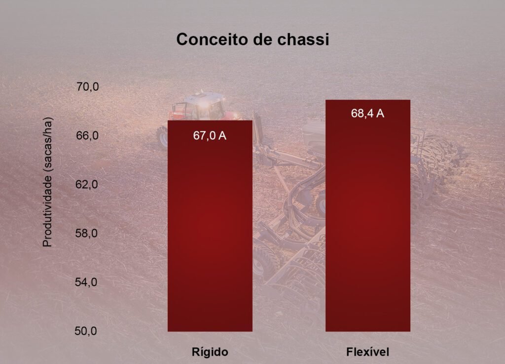 No experimento de plantio, o objetivo foi avaliar o efeito do tipo de chassi – rígido e flexível – na produtividade da soja. Foram utilizados dois modelos de plantadeiras Massey Ferguson, a Momentum 22 L de chassi flexível e a MF 700 20 L de chassi rígido, ambos equipados com sistema de singulação e distribuição de sementes Precision Planting.