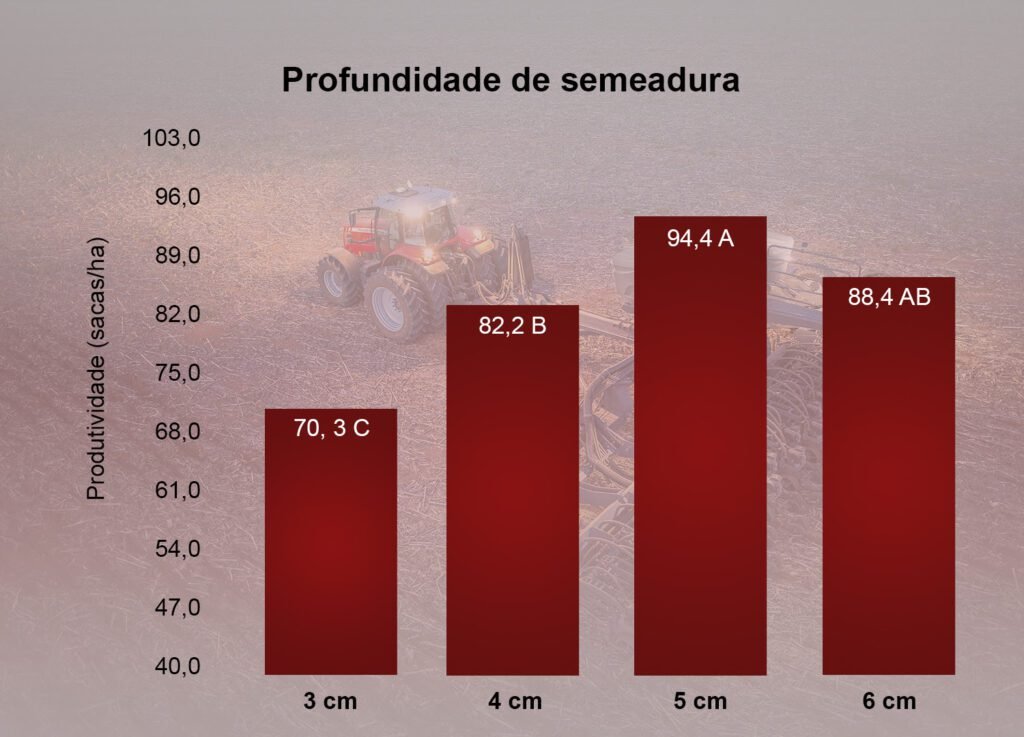 O efeito de profundidade de plantio na produtividade da soja também foi analisado. Os testes foram realizados em quatro profundidades – 3 cm, 4 cm, 5 cm e 6 cm. Para as condições operacionais da fazenda, o melhor resultado (94,4 sacas por hectare) foi alcançado com 5 cm de profundidade.