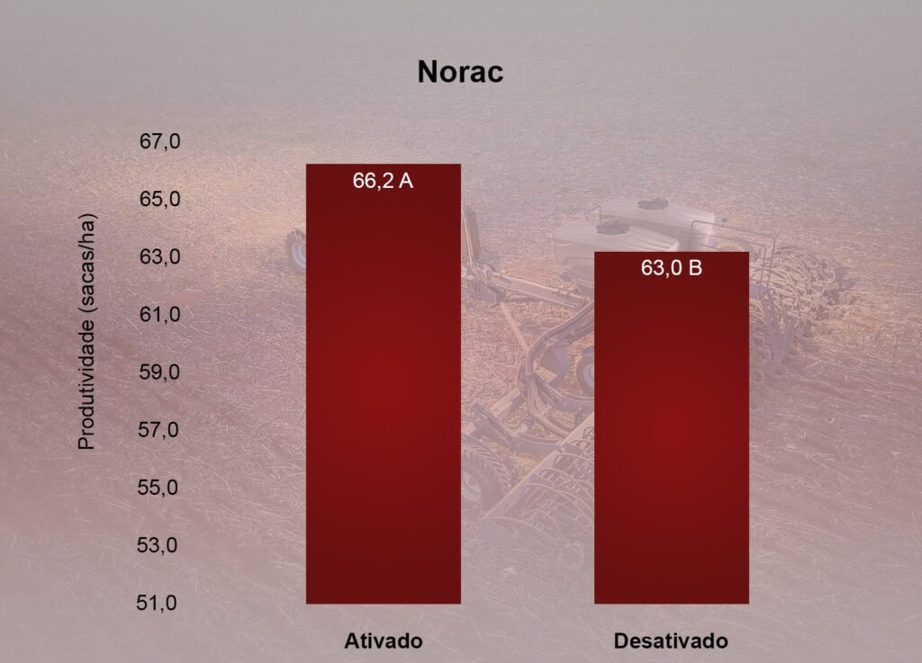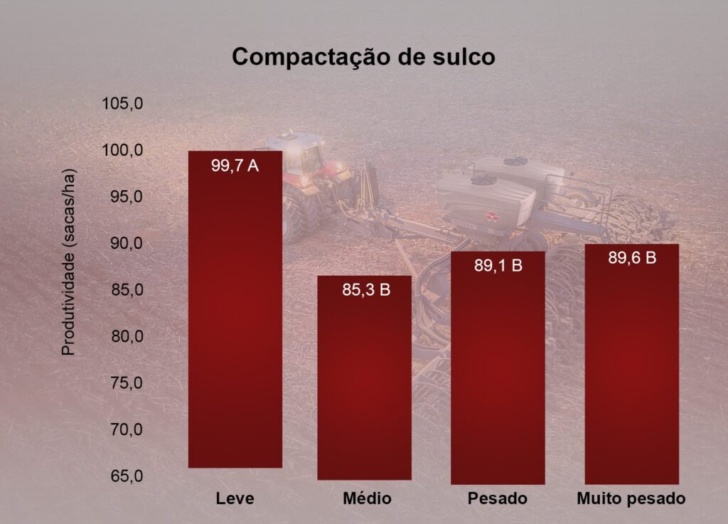 A roda compactadora tem a função de fechar o sulco. A compactação é fundamental para o desenvolvimento da semente, que precisa absorver um pouco de umidade para germinar e conseguir emergir. Quando o solo é mais solto, é necessário produzir a compactação para que os bolsões de ar sejam eliminados, visto que espaços porosos e vazios prejudicam a chegada da água na semente e na planta. Para as condições do solo na fazenda – 60% de argila -. a melhor produtividade foi obtida com a compactação da roda na regulagem leve, com 99,7 sacas de soja por hectare.