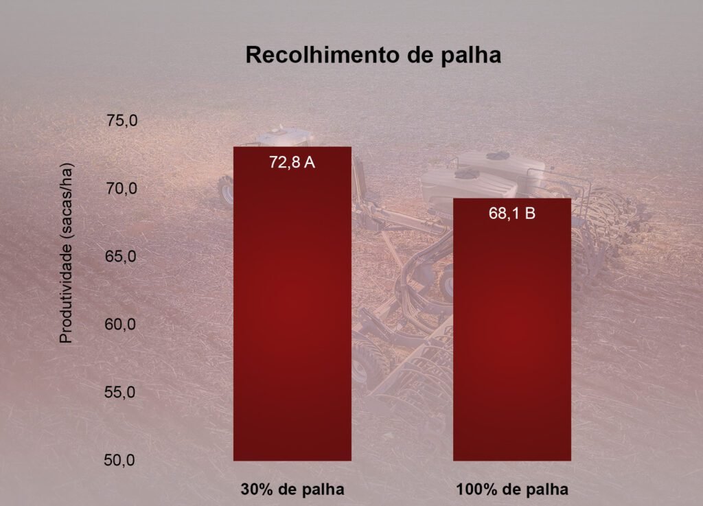 Para verificar a influência da quantidade de palha de trigo pós-colheita sobre a produtividade da soja, o experimento recolheu 70% da palhada de trigo para enfardamento e 30% foi deixada no solo, e como testemunha houve a manutenção de 100% da palhada de trigo no solo. A parcela onde houve o recolhimento de 70% da palhada apresentou o melhor resultado, com 72,8 sacas de soja por hectare. “Este resultado foi devido ao menor volume de palhada, que permitiu que as sementes de soja durante o plantio fossem depositadas no local e profundidade desejada, desta maneira as plantas conseguiram emergir de forma mais homogênea”, aponta Renato Dias, da Massey Ferguson.